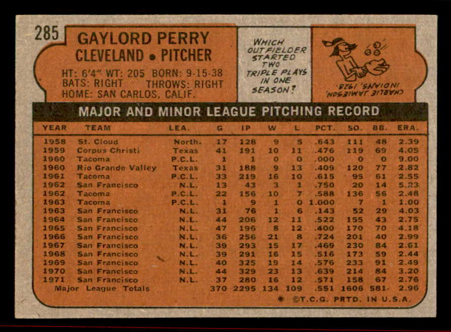 1972 Topps Baseball #285 Gaylord Perry Indians EX-MT 542185