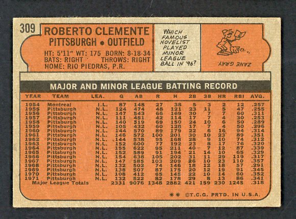 1972 Topps Baseball #309 Roberto Clemente Pirates EX-MT 542210
