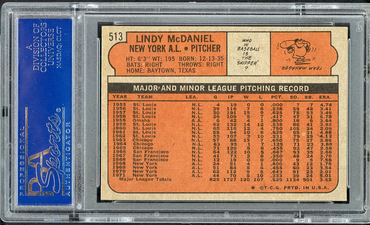 1972 Topps Baseball #513 Lindy McDaniel Yankees PSA 7 NM 547421