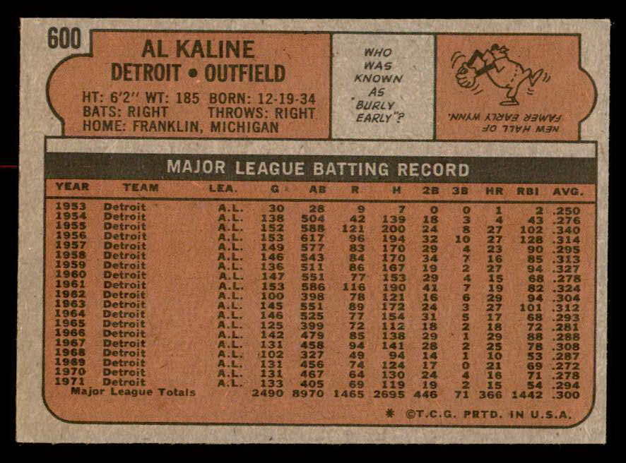 1972 Topps Baseball #600 Al Kaline Tigers EX 545648