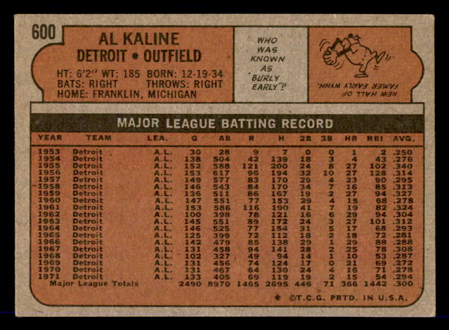 1972 Topps Baseball #600 Al Kaline Tigers VG-EX 546067