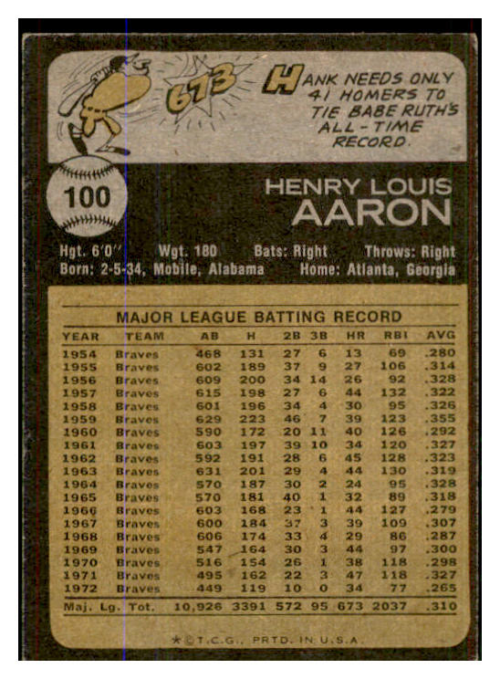 1973 Topps Baseball #100 Hank Aaron Braves VG-EX 537687