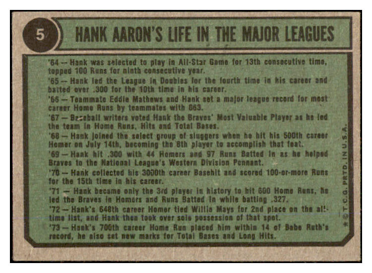 1974 Topps Baseball #005 Hank Aaron Braves VG 530445