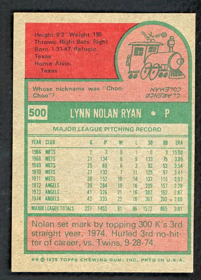 1975 Topps Baseball #500 Nolan Ryan Angels EX+/EX-MT 541784