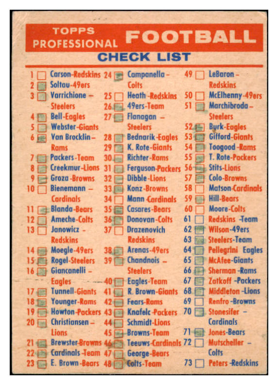 1956 Topps Football Checklist VG Marked 504606