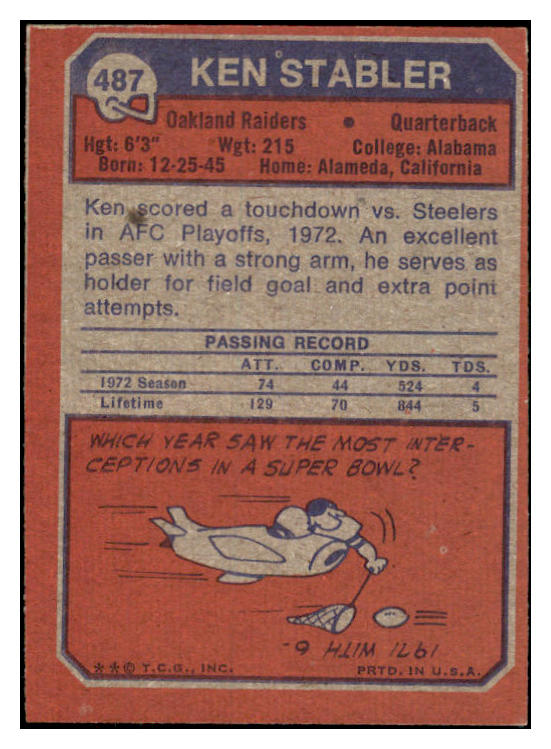 1973 Topps Football #487 Ken Stabler Raiders EX-MT 531858