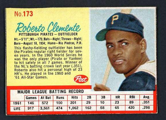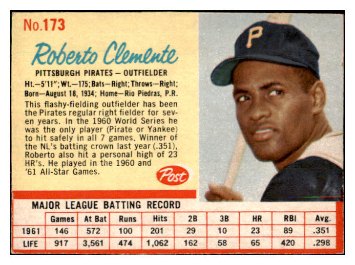 1962 Post Baseball #173 Roberto Clemente Pirates VG-EX 445545
