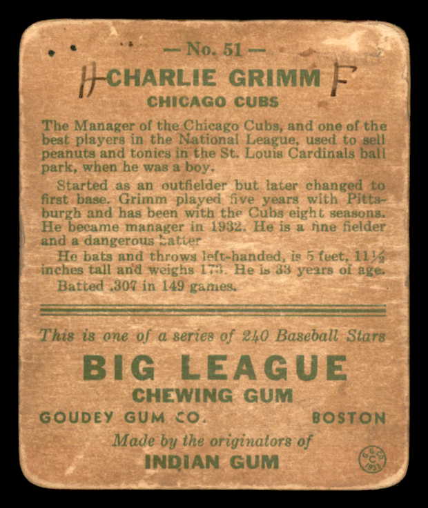 1933 Goudey #051 Charlie Grimm Cubs Signed Autographed
