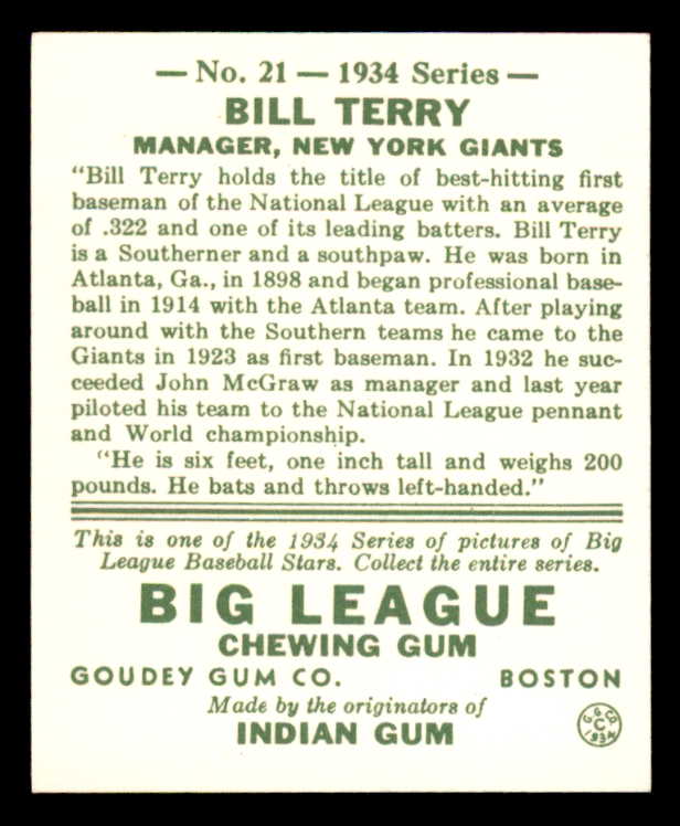 1934 Goudey Reprint #021 Bill Terry Giants Signed Autographed