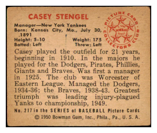 1950 Bowman Baseball #217 Casey Stengel Yankees EX 529255