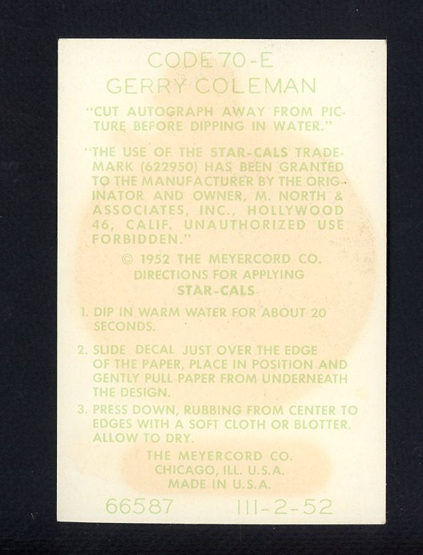 1952 Star Cal Decals 1 #070E Jerry Coleman Yankees no envelope 542426
