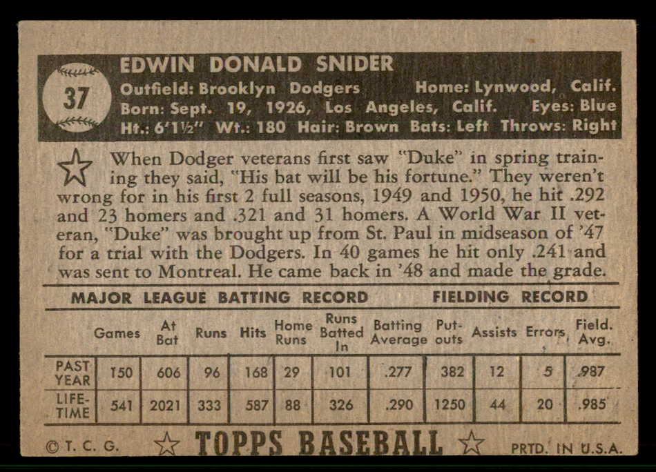 1952 Topps Baseball #037 Duke Snider Dodgers EX Black 542393