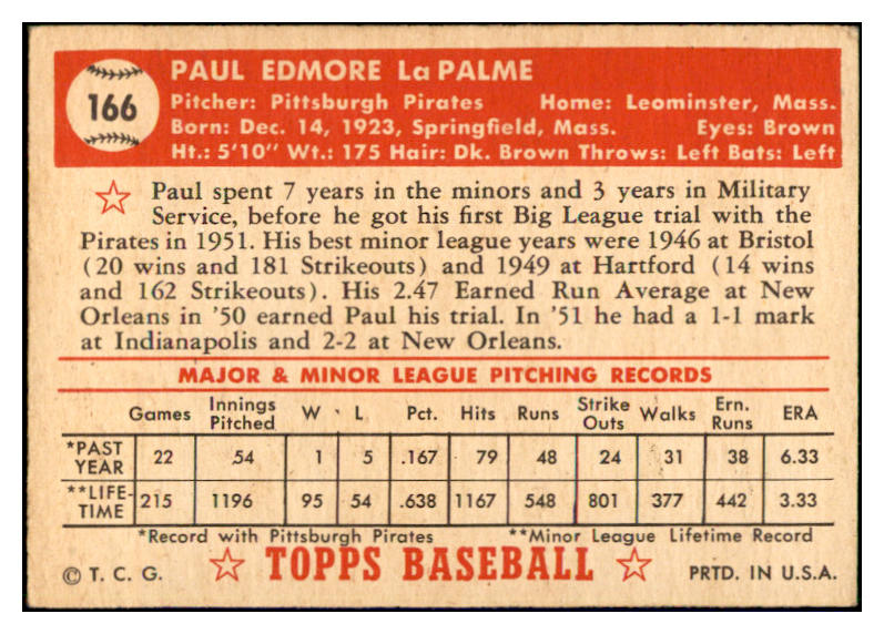 1952 Topps Baseball #166 Paul Lapalme Pirates EX+/EX-MT 532613