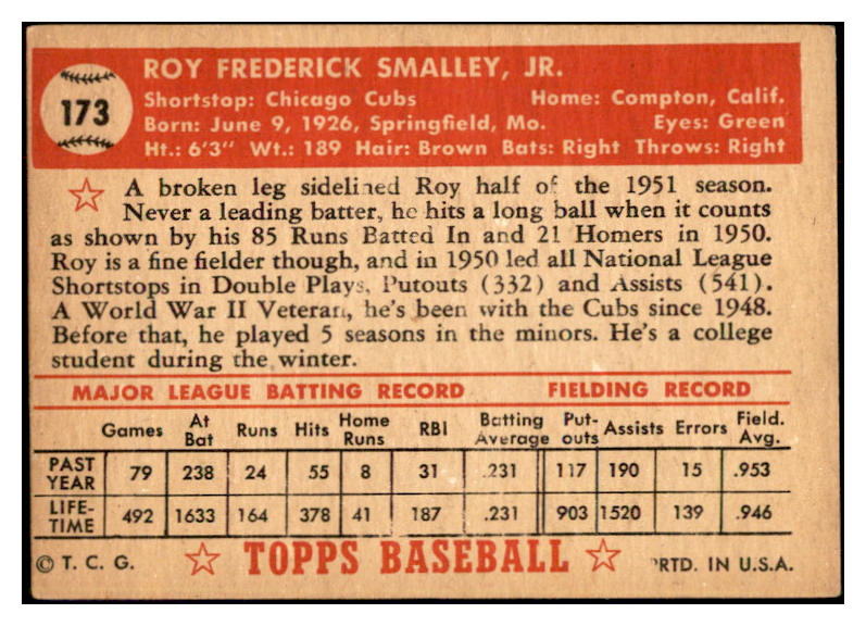 1952 Topps Baseball #173 Roy Smalley Cubs VG-EX 532702