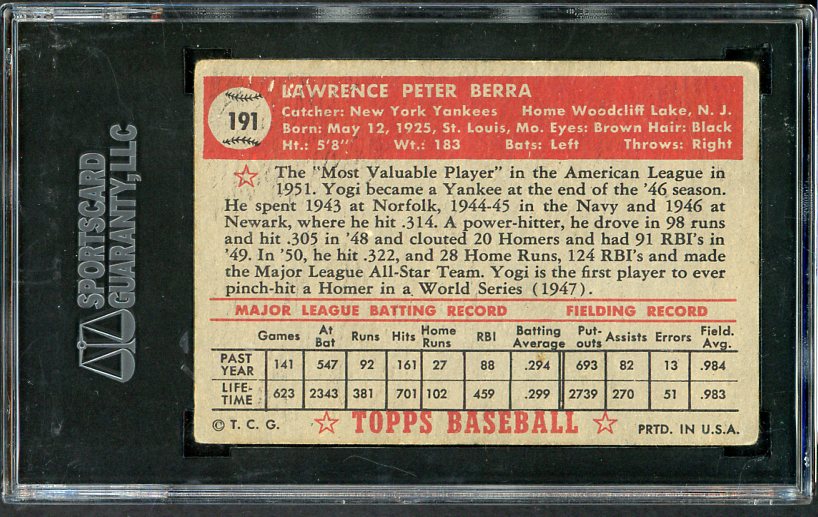 1952 Topps Baseball #191 Yogi Berra Yankees SGC 2.5 GD+ 538300