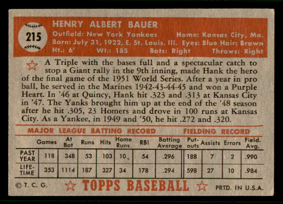 1952 Topps Baseball #215 Hank Bauer Yankees VG-EX 541805
