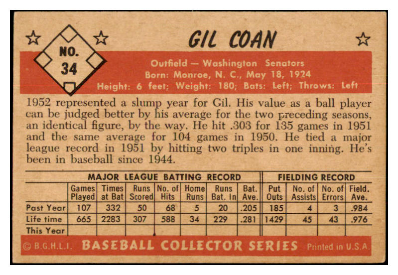 1953 Bowman Color Baseball #034 Gil Coan Senators EX 532270