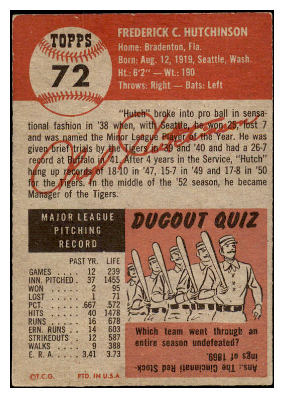 1953 Topps Baseball #072 Fred Hutchinson Tigers EX-MT 528079