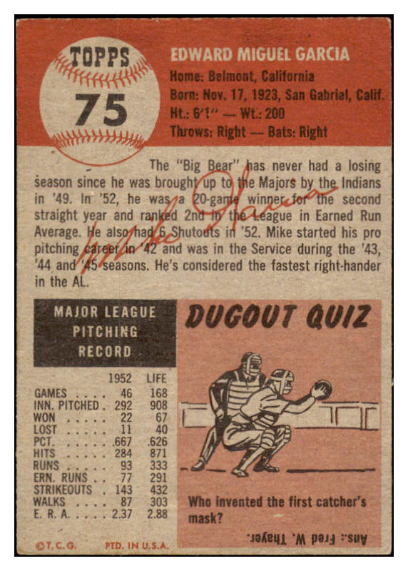 1953 Topps Baseball #075 Mike Garcia Indians EX-MT 528080