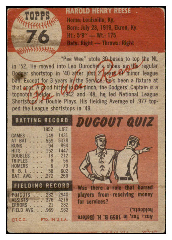 1953 Topps Baseball #076 Pee Wee Reese Dodgers VG-EX 525644