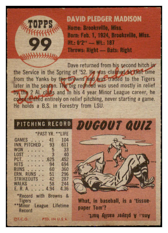 1953 Topps Baseball #099 Dave Madison Tigers EX 528719