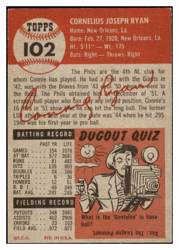 1953 Topps Baseball #102 Connie Ryan Phillies EX-MT 529304