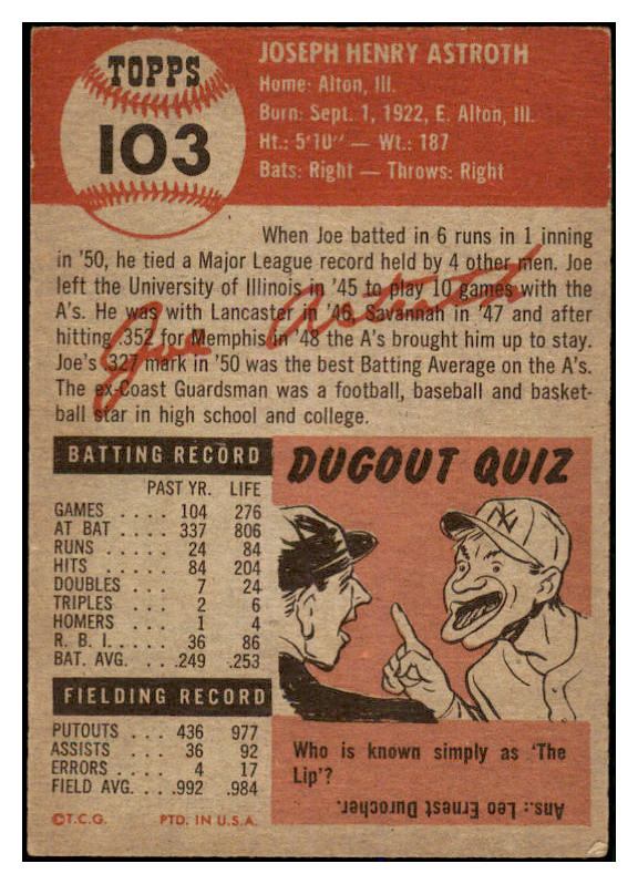 1953 Topps Baseball #103 Joe Astroth A's EX-MT 528680