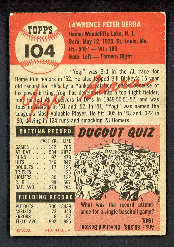 1953 Topps Baseball #104 Yogi Berra Yankees VG-EX 543305