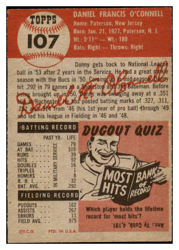 1953 Topps Baseball #107 Danny O'Connell Pirates EX-MT 528607