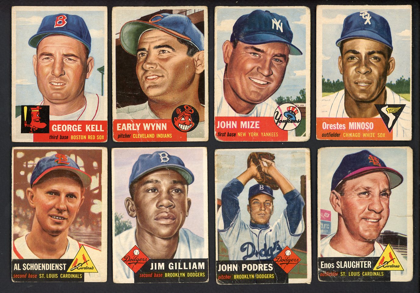 Have you ever wanted to collect 1953 Topps? Here is a chance to pick up about 90% of all cards in the set (mainly missing the very pricey cards - Mantle, Mays, Robinson, Paige, etc.). We may have miscounted but it looks like it is missing just 25 cards. Cards are lower grade, ranging from GD-VG to VG-EX (some EX), some less. Includes Rizzuto VG, Berra VG, Ford GD-VG, Schoendienst GD-VG, Jensen GD-VG, Slaughter FR-GD, Spahn GD (small stamp mark back), Campanella FR-GD, Podres rookie FR, Gilliam rookie GD, Irvin VG, Mize FR, Reese GD, Minoso FR, Wynn PR-FR, Kell GD, Martin nice but small paper loss, Burgess VG, Labine, Blackwell, McDougald, Black, Lopat, Nuxhall, Sain, Rosen, D. Willams, Reynolds, Wilhelm, D. DiMaggio (weak), Groat, Kluszewski, Shantz, Newhouser (rough), Face, Roe, Woodling, Bolling (weak), etc. Est. retail 5000-5500.00. Buy with confidence. We are the oldest full-time dealer in America, serving collectors since 1976. ALL CARDS ARE SUBJECT TO YOUR APPROVAL. If you ever receive anything that is unsatisfactory you may return it for replacement or full refund. The card pictured is the actual card you will receive. For orders or assistance, call our Toll Free number 888-548-9686 weekdays 8-6 Pacific.