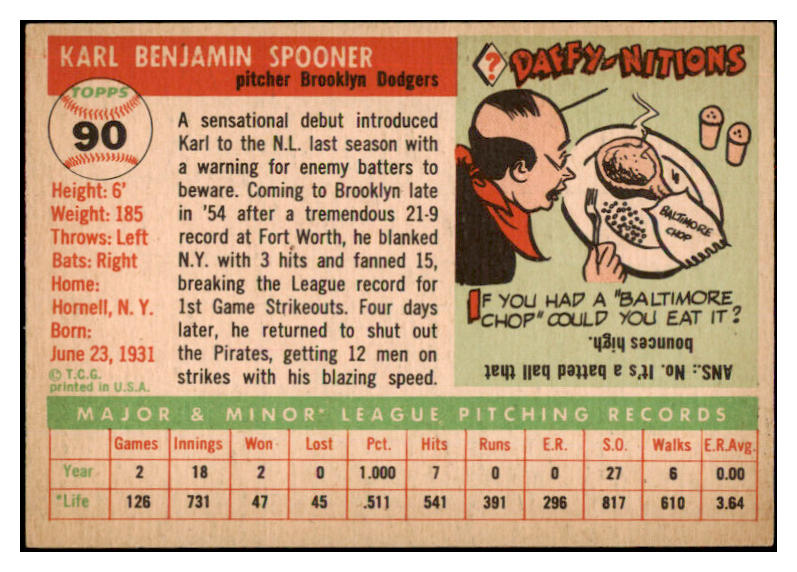 1955 Topps Baseball #090 Karl Spooner Dodgers NR-MT 524656