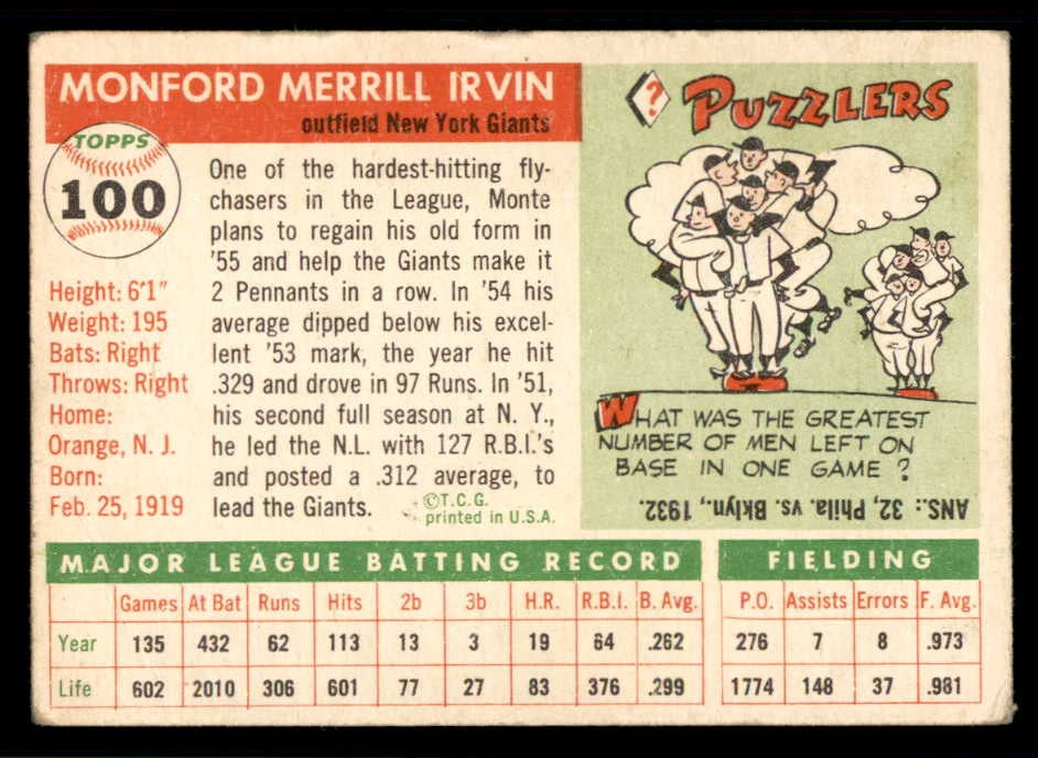 1955 Topps Baseball #100 Monte Irvin Giants VG 543248