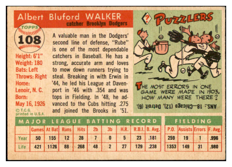 1955 Topps Baseball #108 Rube Walker Dodgers EX-MT 534960