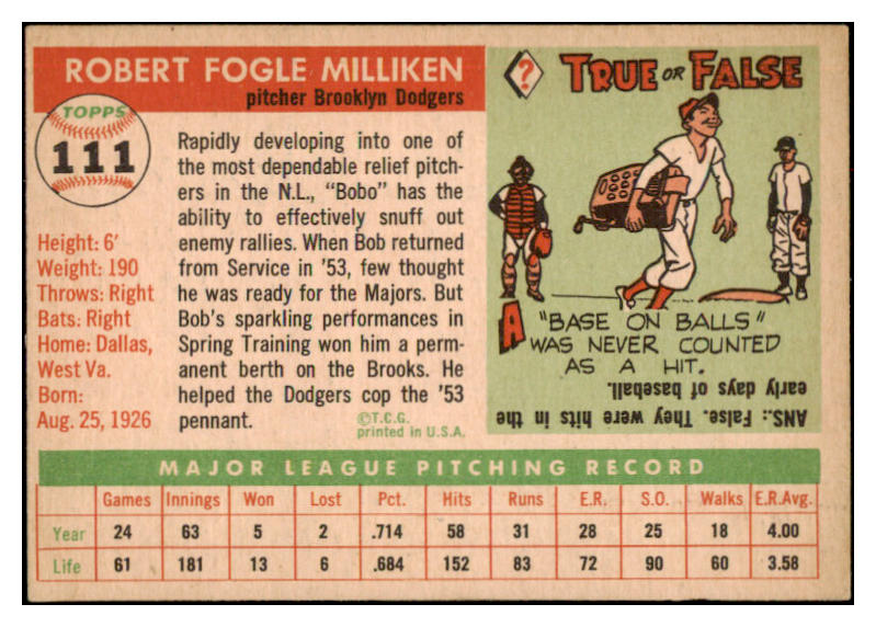 1955 Topps Baseball #111 Bob Milliken Dodgers NR-MT 524671