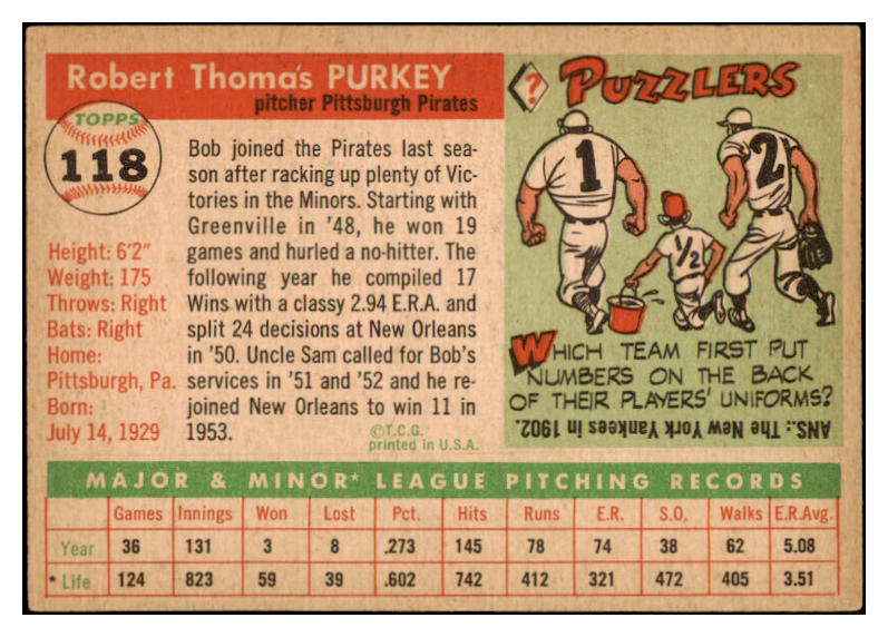 1955 Topps Baseball #118 Bob Purkey Pirates EX-MT 528147
