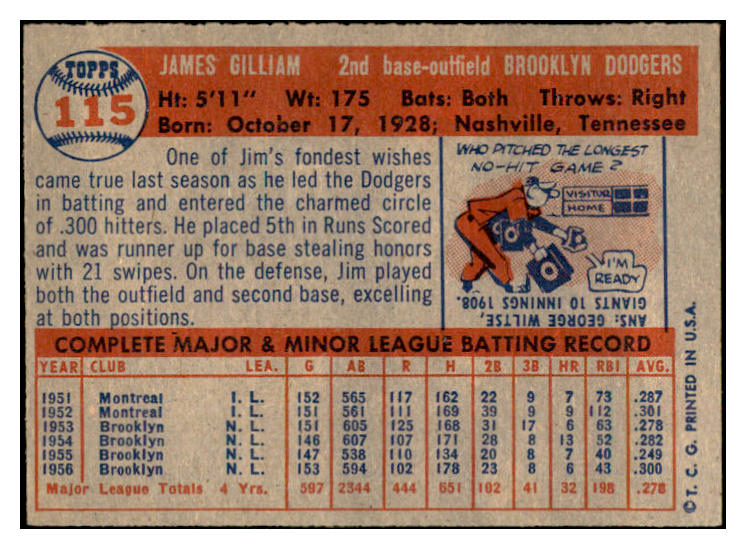 1957 Topps Baseball #115 Jim Gilliam Dodgers EX+/EX-MT 532489