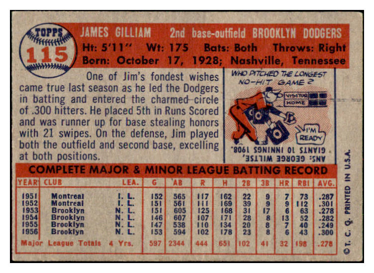 1957 Topps Baseball #115 Jim Gilliam Dodgers EX-MT 531027