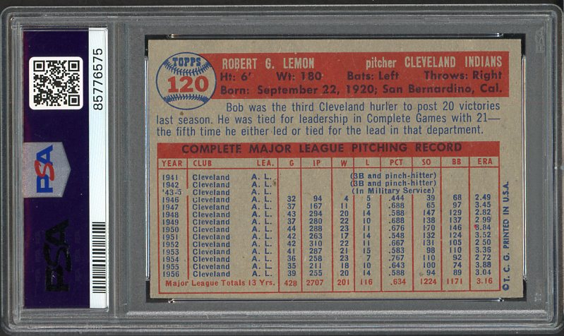 1957 Topps Baseball #120 Bob Lemon Indians PSA 7 NM 537924