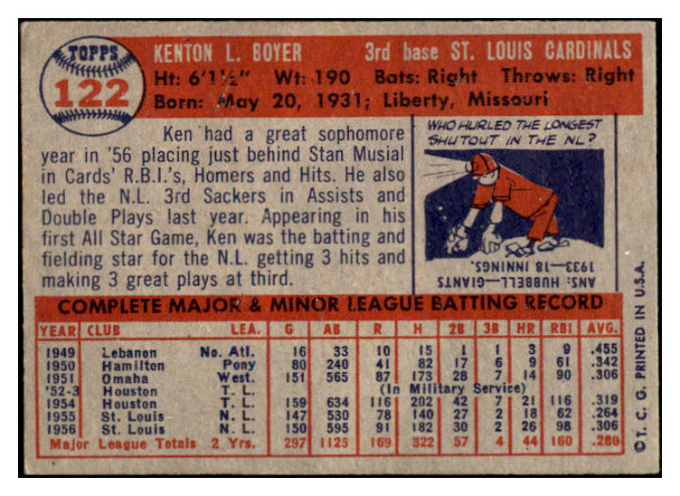 1957 Topps Baseball #122 Ken Boyer Cardinals EX 524945