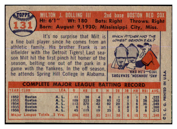 1957 Topps Baseball #131 Milt Bolling Red Sox EX-MT 527656