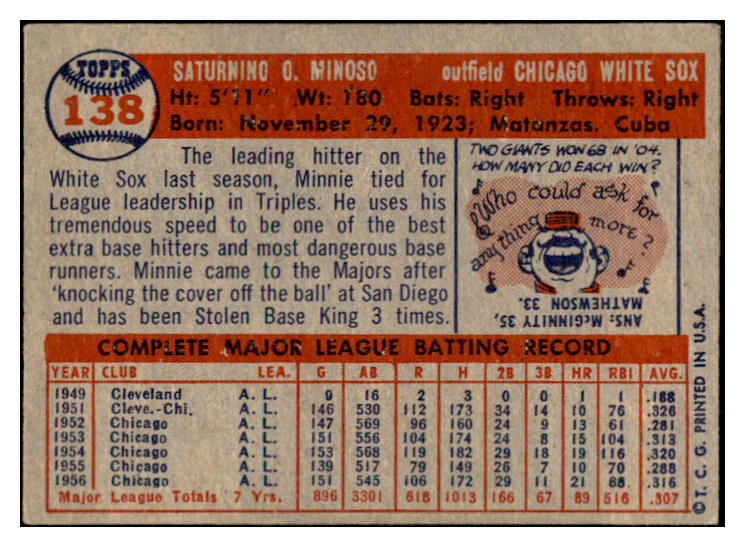 1957 Topps Baseball #138 Minnie Minoso White Sox EX 532511