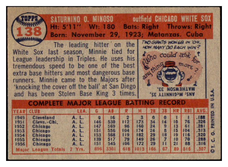 1957 Topps Baseball #138 Minnie Minoso White Sox EX-MT 523772