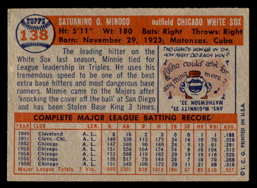 1957 Topps Baseball #138 Minnie Minoso White Sox EX-MT 540095
