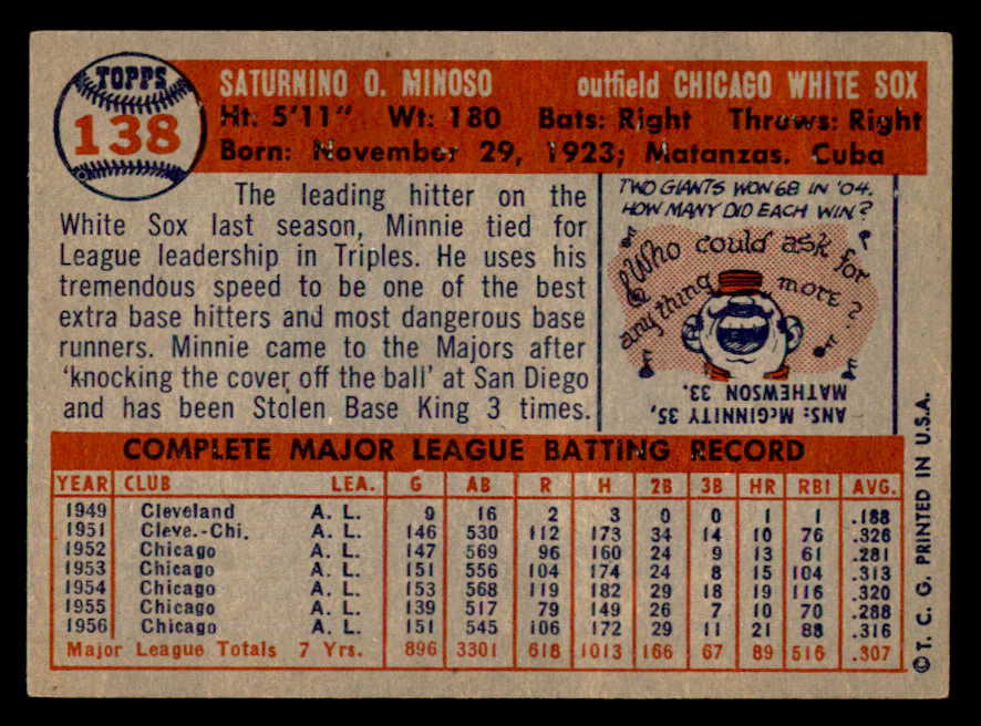 1957 Topps Baseball #138 Minnie Minoso White Sox EX-MT 540096