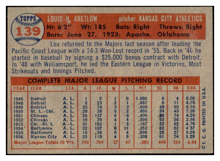 1957 Topps Baseball #139 Lou Kretlow A's NR-MT 534919