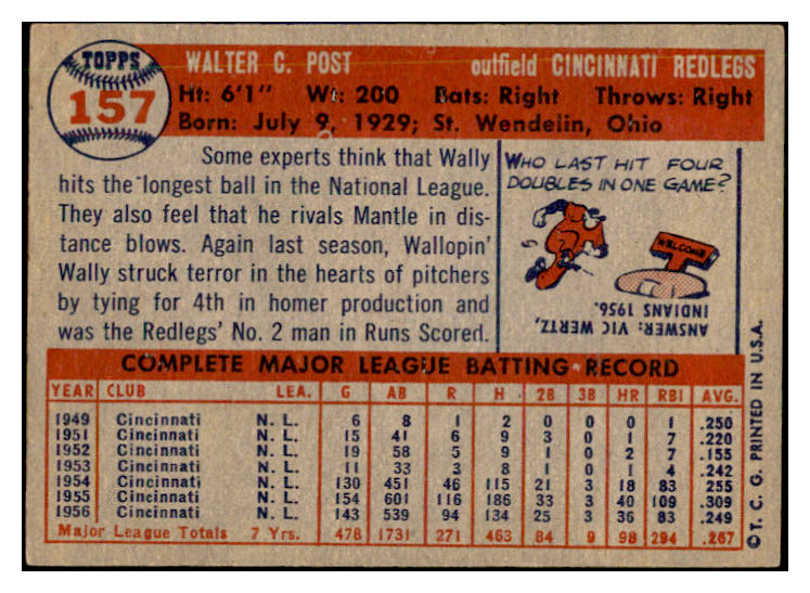 1957 Topps Baseball #157 Wally Post Reds EX-MT 535454