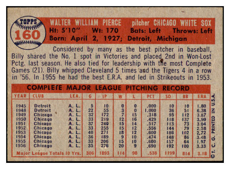 1957 Topps Baseball #160 Billy Pierce White Sox EX 523801