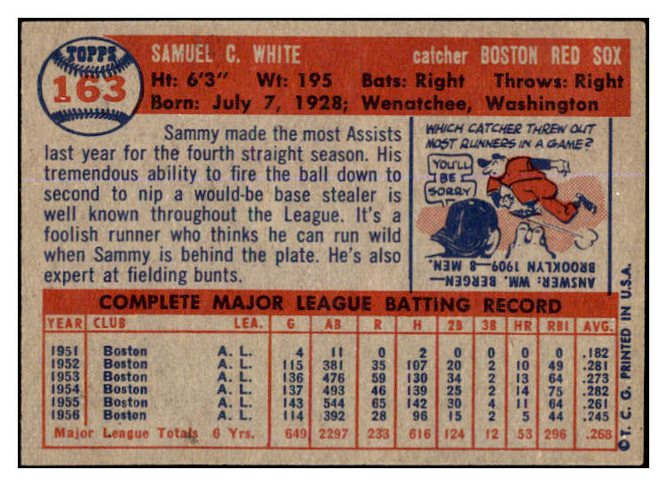 1957 Topps Baseball #163 Sammy White Red Sox EX-MT 527670