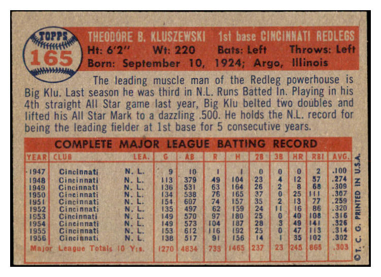 1957 Topps Baseball #165 Ted Kluszewski Reds EX-MT 530995
