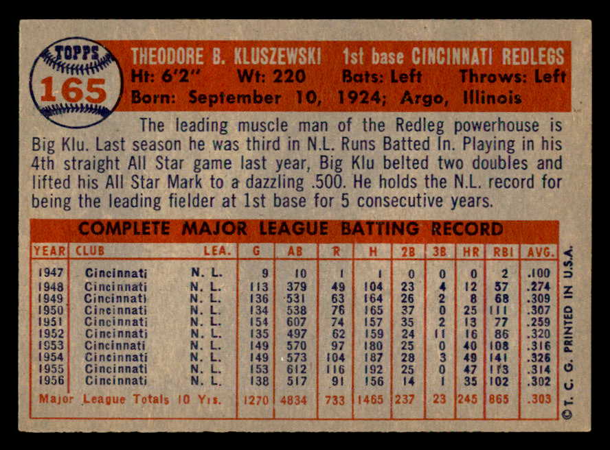 1957 Topps Baseball #165 Ted Kluszewski Reds EX-MT 540047